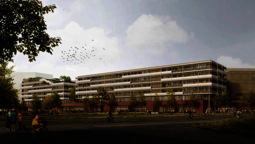 Das Schulgebäude mit integrierter Kita besteht aus 2 Gebäudeteilen, die mit einem Verbindungsbau gekoppelt sind. Die Schule besteht aus 5 Obergeschossen, einem Erdgeschoss und einem Untergeschoss für Technikflächen und Fahrradstellplätzen. Der dreigeschossige Sporthallenkomplex beinhaltet Einfeld-, Zweifeld- und Dreifeldsporthallen übereinander. Das Schulgebäude wird als Holzhybridbauweise errichtet, die Klassenzimmerbereiche erhalten Holzbetonverbunddecken, lediglich die Flurbereiche und Erschließungskerne werden in Stahlbeton hergestellt. Die Außenstützen werden als Holzstützen errichtet. Alle Holzbauteile werden mittels Heißbemessung nachgewiesen. Ab dem 1.OG nach unten wird das Tragwerk vollständig in Massivbauweise errichtet. Im Sporthallenkomplex kommen Stahlverbundträger zum Einsatz, sonst wird Stahlbeton eingesetzt. Die Dachkonstruktion ist als leichte Stahlkonstruktion mit einer Dachhaut aus Trapezblech geplant. Das Gebäude wird als Sonderbau in Gebäudeklasse 5 eingestuft. Für die Bewertung der Holzhybridkonstruktion mit vorgesetzter Holzfassade wird die Musterholzbaurichtlinie in Anwendung gebracht.